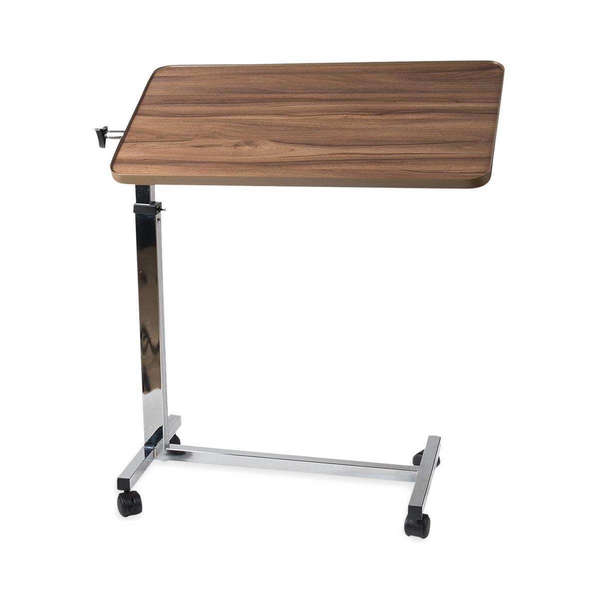 - Overbed table with 4 casters has a durable laminate top and chrome-plated steel column and base